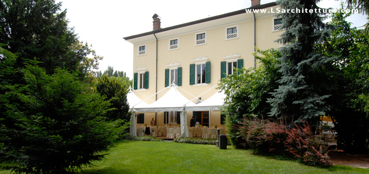 Il complesso, comprendente l’edificio di villa ed il bassocomodo accanto, è immerso in un parco di campagna comprendente un giardino formale a contaminazioni romantiche che si dissolve progressivamente nei caratteri del parco.
